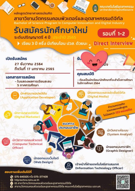 สาขานวัตกรรมคอมพิวเตอร์และอุตสาหกรรมดิจิทัล รับสมัครนักศึกษาใหม่ รอบที่ Porfolio ปี 2565 รอบ 2 เปิดรับสมัครแล้วตั้งแต่วันที่ 27 ธันวาคม 2564 - 17 มกราคม 2565 |
