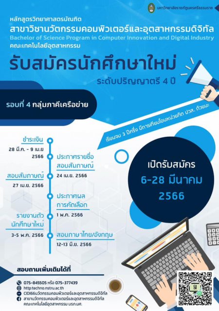 สาขานวัตกรรมคอมพิวเตอร์และอุตสาหกรรมดิจิทัล เปิดรับนักศึกษาใหม่ระดับปริญญาตรี ปีการศึกษา 2566 รอบภาคีเครือข่าย เปิดรับสมัครตั้งแต่วันที่ 6 มีนาคม - 28 มีนาคม 2566 รายละเอียดเพิ่มเติมสามารถดูได้ที่ไฟล์ประกาศ |