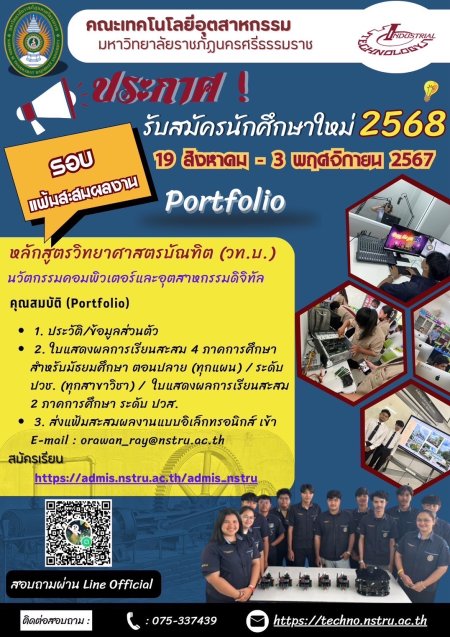 หลักสูตรวิทยาศาสตรบัณฑิต สาขานวัตกรรมคอมพิวเตอร์และอุตสาหกรรมดิจิทัล รับสมัครนักศึกษาใหม่ 2568 แล้ว รอบ Portfolio นี้ ตรวจสอบคุณสมบัติจากแฟ้มสะสมผลงาน และการสอบสัมภาษณ์เท่านั้น โดยนักศึกษาจัดทำประวัติ ข้อมูลส่วนตัว ใบแสดงผลการเรียนที่ผ่านมา ส่งเข้าอีเมล orawan_ray@nstru.ac.th และสมัครเรียนผ่านระบบรับสมัครของมหาวิทยาลัย |